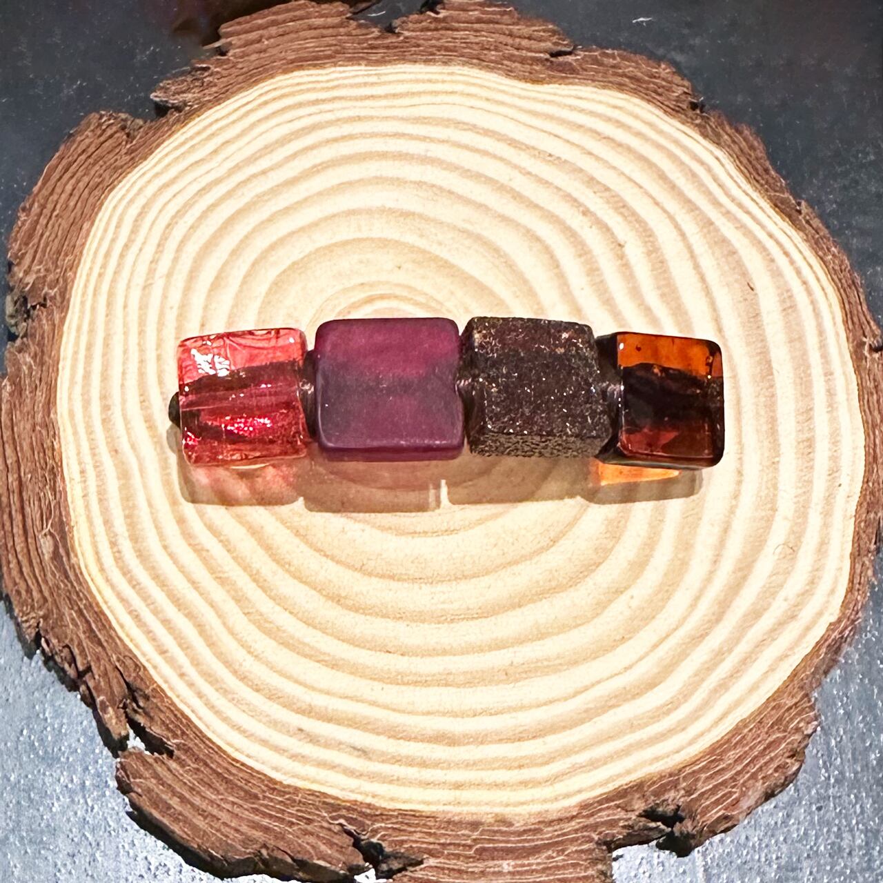 ヴェネチアンガラスをイタリアンシルクの糸で巻いたバレッタです。 カラー:ルビーノ×ロッソ×マローネ サイズ:5.5×2.0cm イタリア製