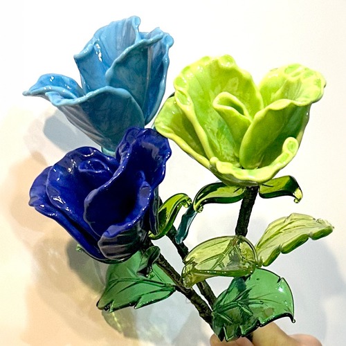 ヴェネチア ムラーノ島からガラスのバラが届きました。 花びらや葉っぱも1枚1枚が芸術的なフォルム、まるで本物、 それ以上に生き生きして美しく輝いています。 ヴェネチアンガラスの花弁を 幾重にも重ねてシルク糸を巻き付けて仕上げます。 贈り物として一輪添えるだけで、 送り主のセンスが輝く、そんな一品です。 カラー:Verde(グリーン) ・花びら5枚 ・ガク3枚 ・リーフ2枚