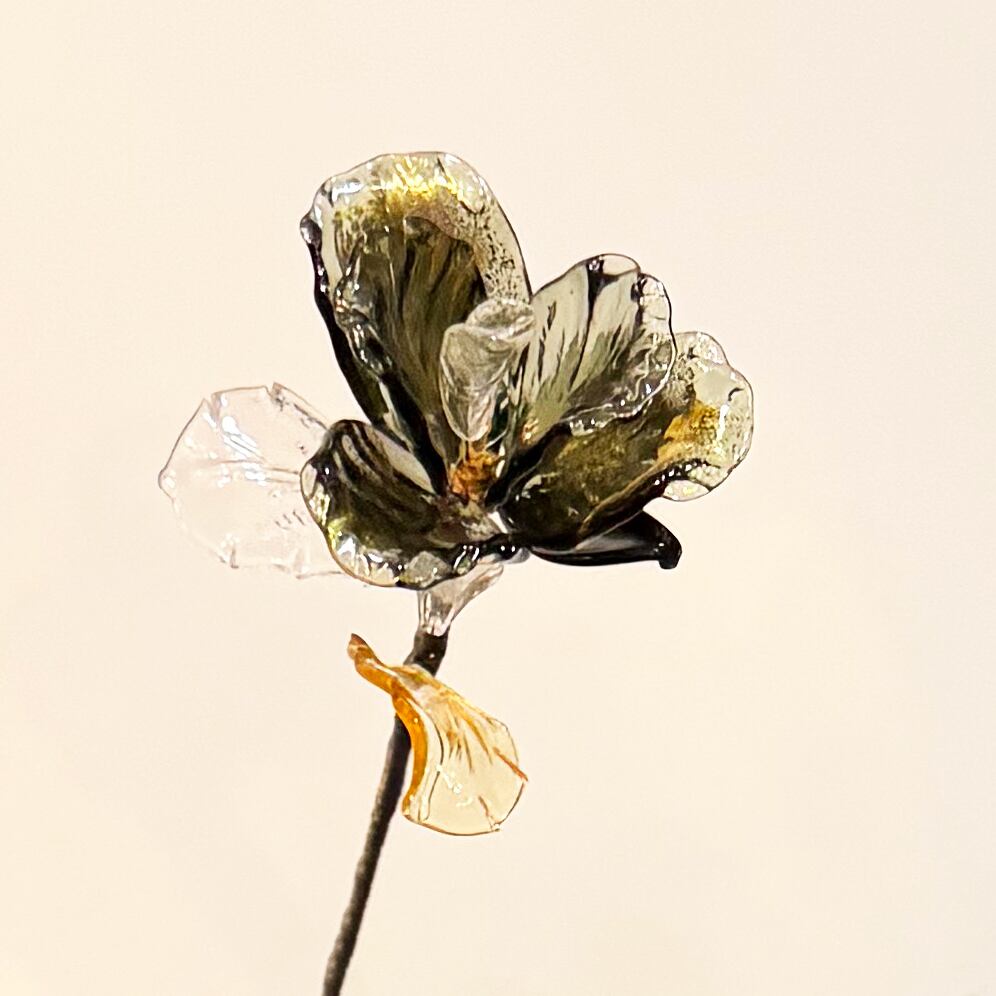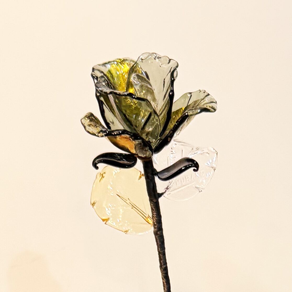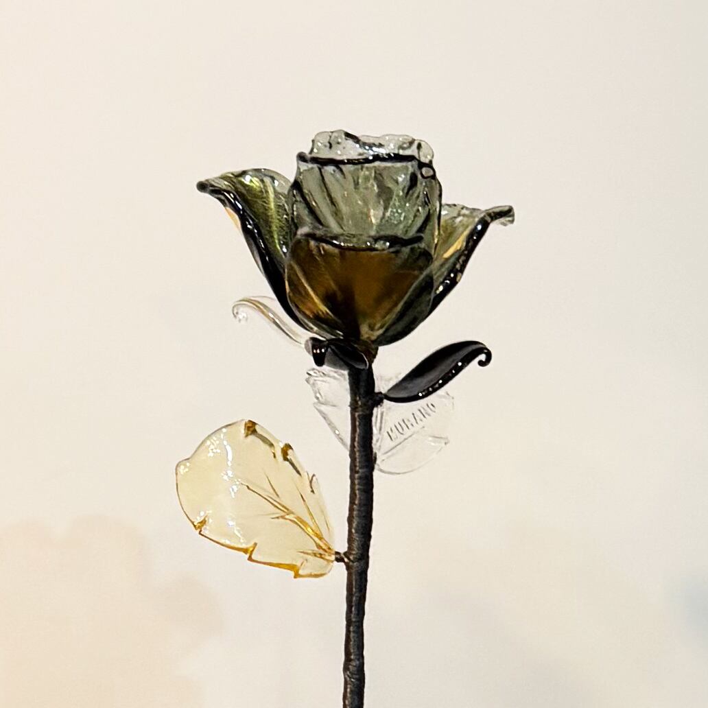 ヴェネチア ムラーノ島からガラスのバラが届きました。 花びらや葉っぱも1枚1枚が芸術的なフォルム、まるで本物、 それ以上に生き生きして美しく輝いています。 ヴェネチアンガラスの花弁を 幾重にも重ねてシルク糸を巻き付けて仕上げます。 贈り物として一輪添えるだけで、 送り主のセンスが輝く、そんな一品です。 花びら ・クリア×2 枚 ・ゴールド×3枚 リーフ ・小×3枚 ・大×2枚 カラー:モノトーン