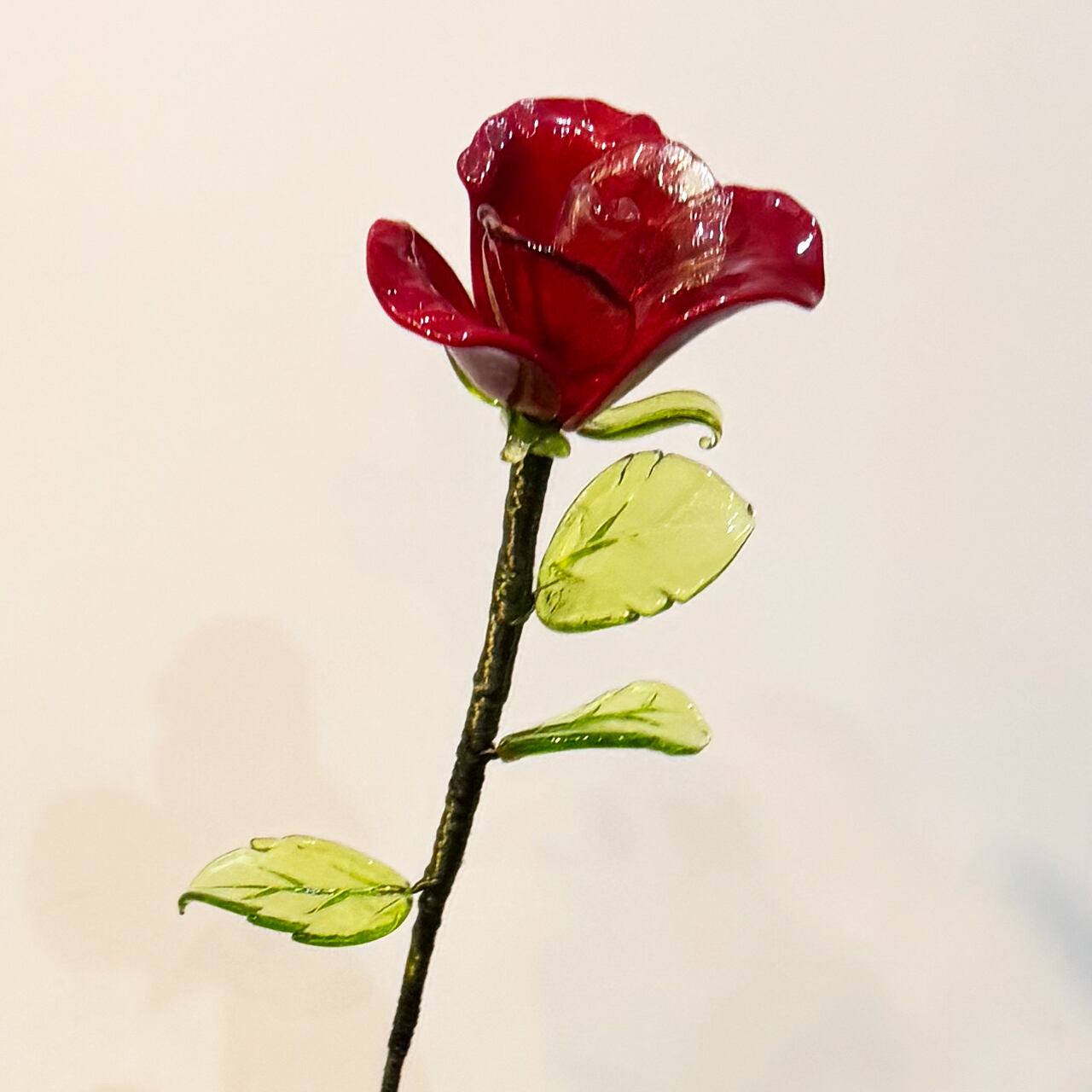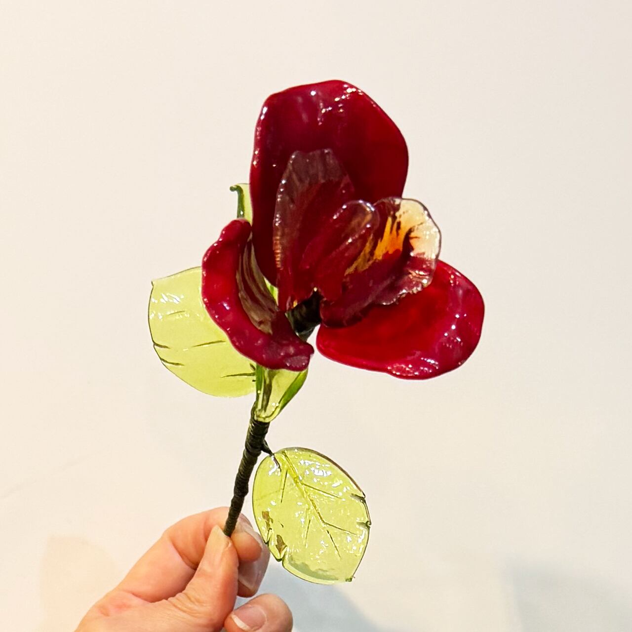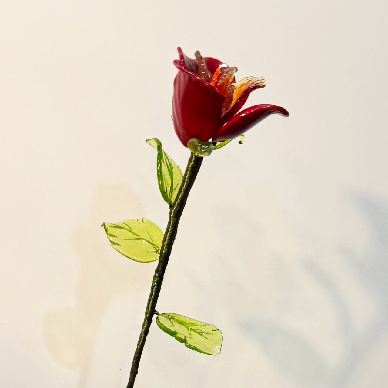 ヴェネチア ムラーノ島からガラスのバラが届きました。 花びらや葉っぱも1枚1枚が芸術的なフォルム、まるで本物、 それ以上に生き生きして美しく輝いています。 ヴェネチアンガラスの花弁を 幾重にも重ねてシルク糸を巻き付けて仕上げます。 贈り物として一輪添えるだけで、 送り主のセンスが輝く、そんな一品です。 花びら ・パステル×3枚 ・クリア×2枚 リーフ ・小×3枚 ・大×3枚 カラー:レッド