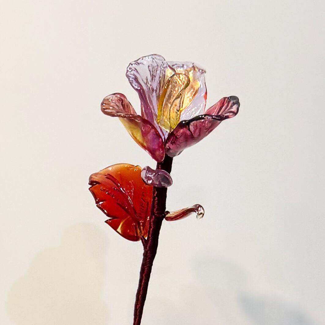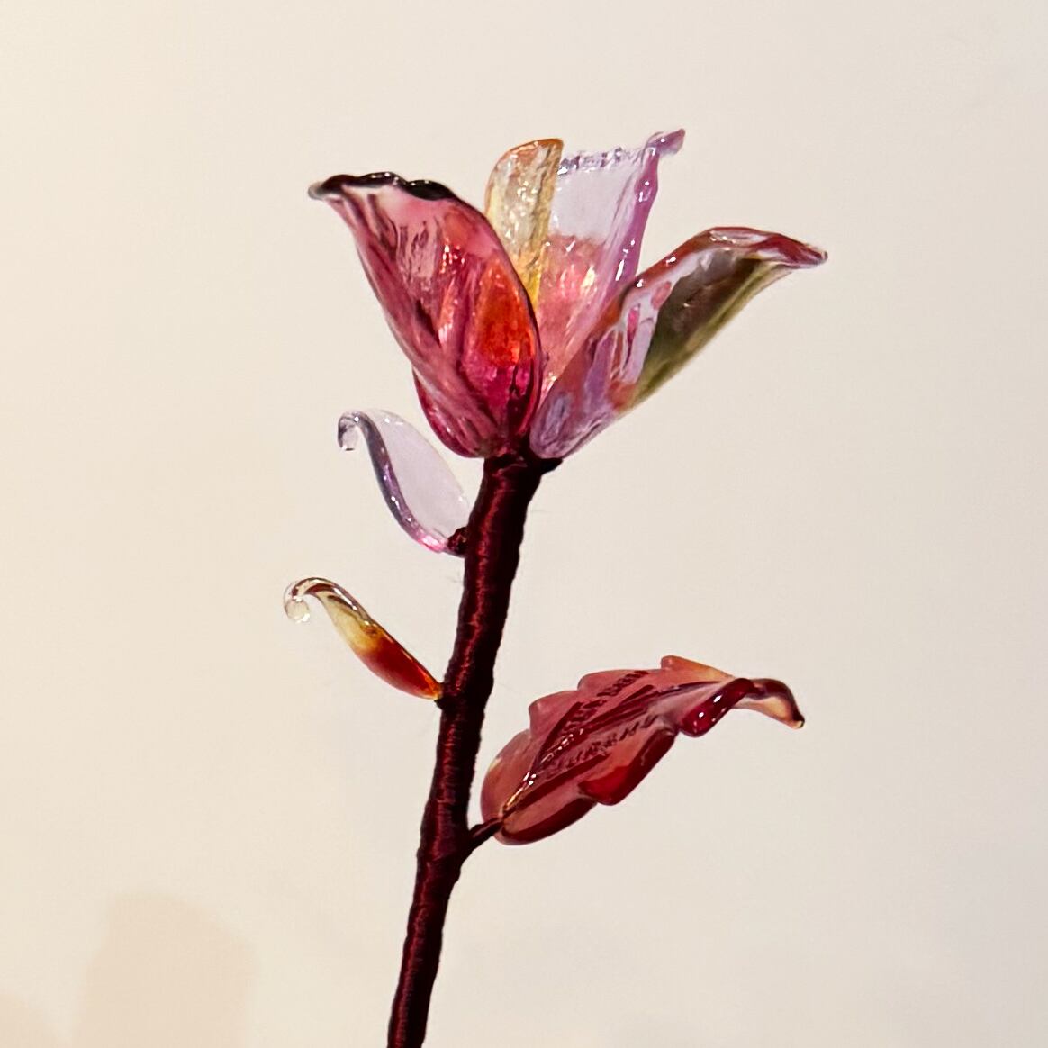 ヴェネチア ムラーノ島からガラスのバラが届きました。 花びらや葉っぱも1枚1枚が芸術的なフォルム、まるで本物、 それ以上に生き生きして美しく輝いています。 ヴェネチアンガラスの花弁を 幾重にも重ねてシルク糸を巻き付けて仕上げます。 贈り物として一輪添えるだけで、 送り主のセンスが輝く、そんな一品です。 花びら ・クリア×4 枚 ・ゴールド×2枚 リーフ ・小×2枚 ・大×1枚 カラー:ローザ