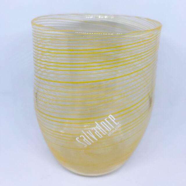 細かいレース模様のガラス細工フィリグラーナ。 ムラーノ島のサルバドーレ工房からの直輸入です。 飲み口の薄さや縞模様が職人の技が光ります。 飲み物を注いで氷を入れると、なんとも言えない美しい音がします。 是非お手に取り本物を味わって見てください。 カラー:イエロー サイズ:高さ 約10cm 飲み口直径 約7.5cm